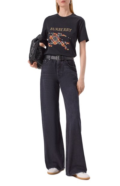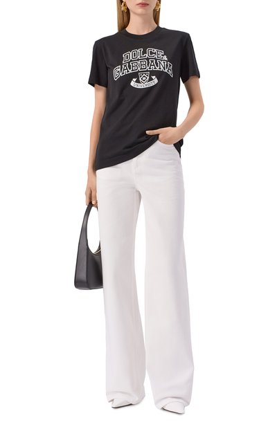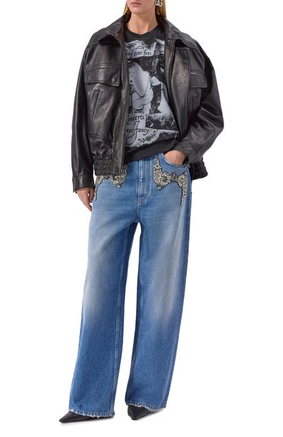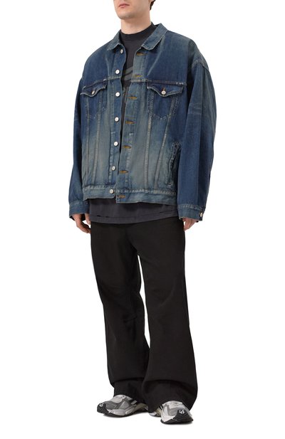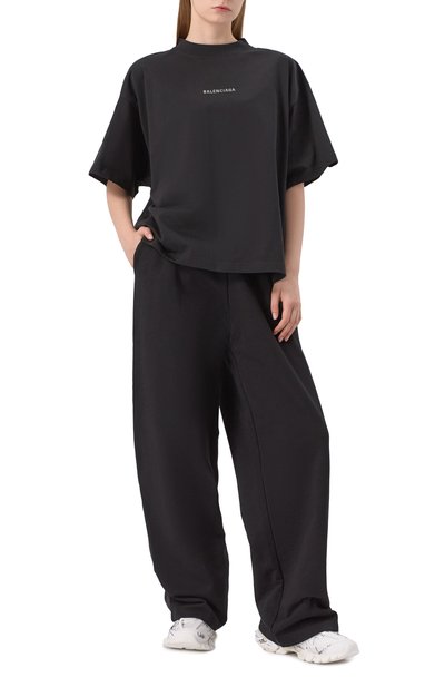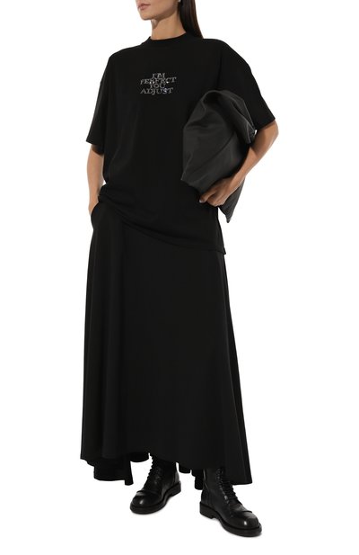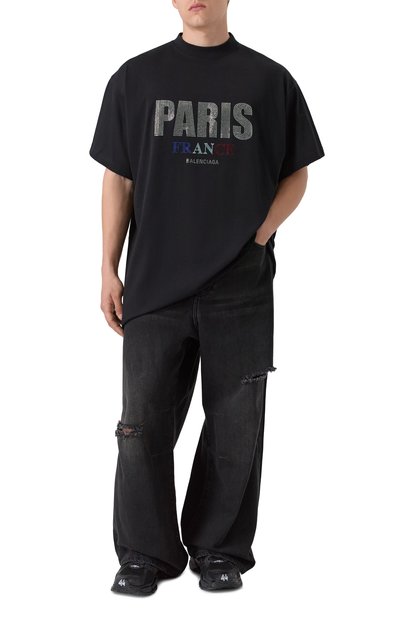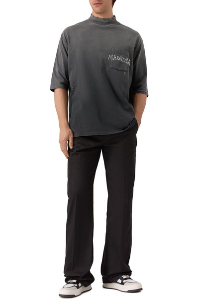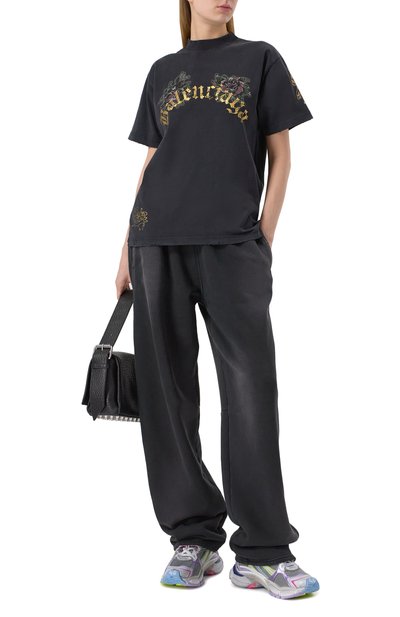 Футболку свободного кроя сшили из выбеленного хлопкового джерси. Модель с круглым вырезом и спущенной линией плеч украсили урбанистическим принтом и логотипом марки.
