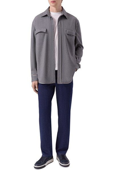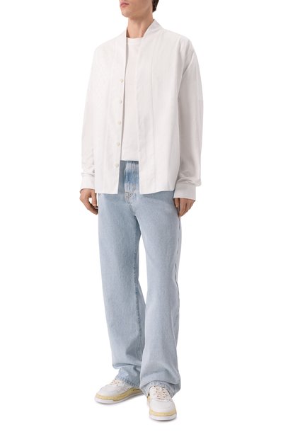 Декоративно состаренную куртку-рубашку с потертостями по краям сшили из хлопка. Внутреннюю часть воротника и манжет отделали клетчатой тканью. Модель свободного кроя дополнили нагрудными карманами, один из которых украсили логотипом марки.