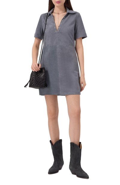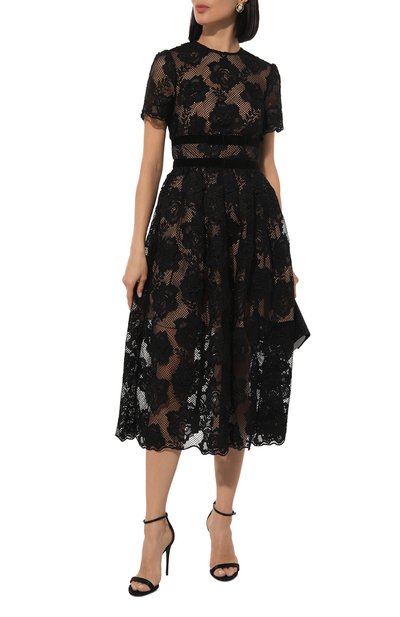 Приталенное платье, украшенное атласным бантом под V-образным декольте, выполнили из смесового фестончатого кружева. Модель с нижним мини-платьем из кади застегивается потайной молнией сзади.