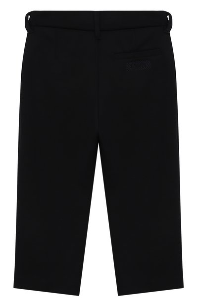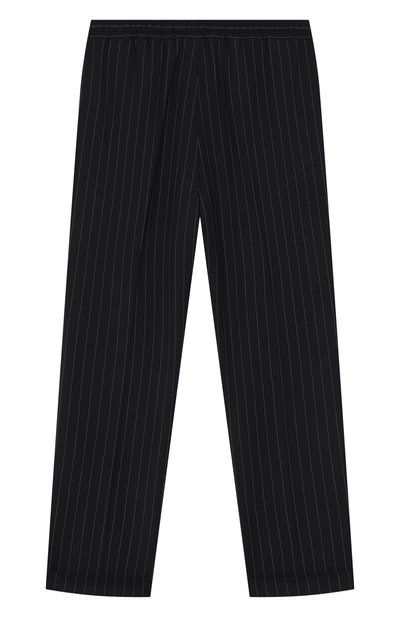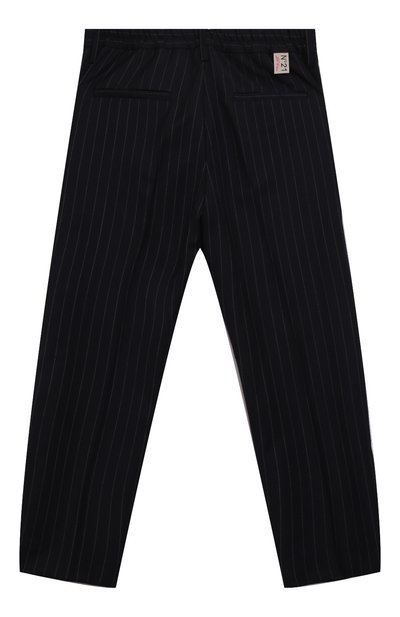 Полосатые брюки прямого кроя выполнили из стрейчевой ткани на основе полиэстера и вискозы. Модель с регулируемым поясом-кулиской дополнили боковыми карманами и задними с декоративными пуговицами на клапанах.