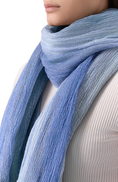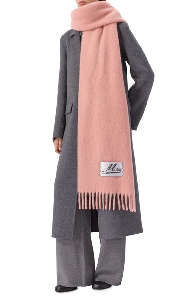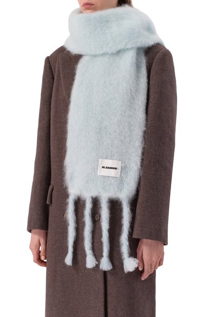 Широкий шарф выполнили из ворсистого текстиля на основе шерсти альпака с добавлением нейлона. Модель с бахромой по краям украсили контрастным вышитым логотипом.