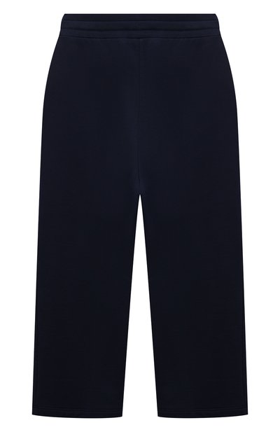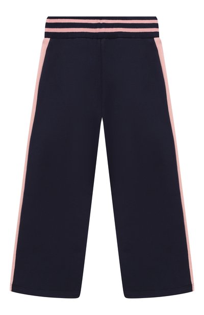Брюки с полосатым рифленым поясом-кулиской выполнили из хлопкового трикотажа. Модель с двумя боковыми карманами и контрастными лампасами украсили фирменным прорезиненным патчем.
