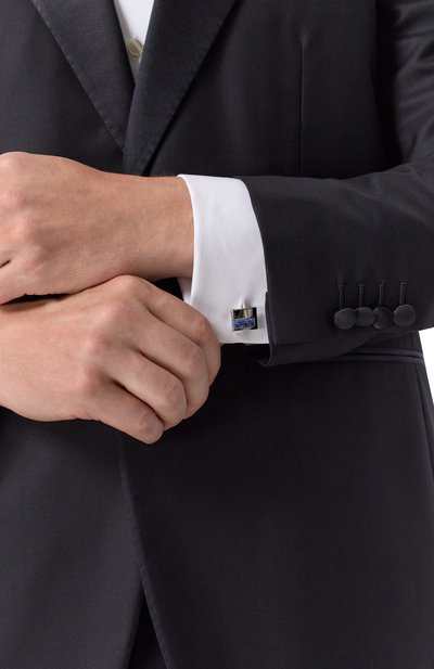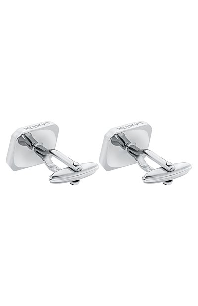Запонки из латуни с гальваническим покрытием родием инкрустированы кубическими циркониями. О принадлежности аксессуара марке говорят тисненые логотипы.