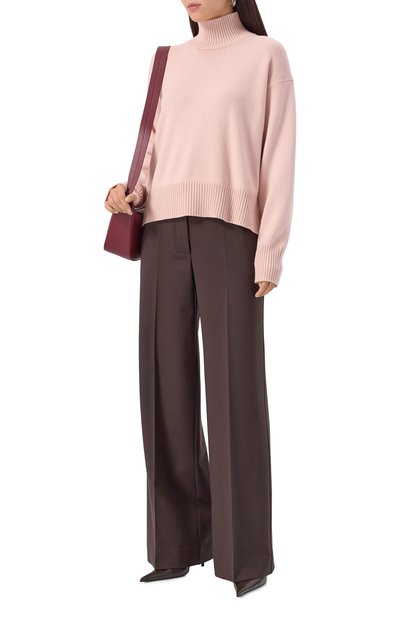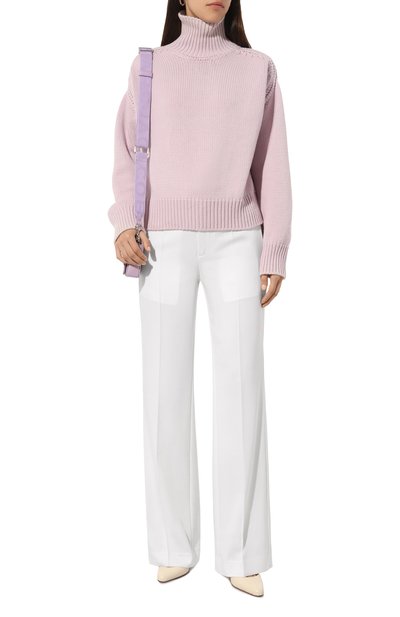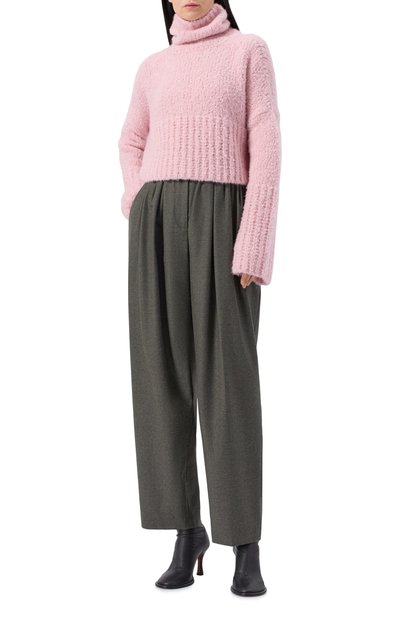 Свитер со спущенной линией плеч и разрезами по бокам связали из шерстяной пряжи. Модель с высоким воротником, манжетами и широким поясом в рубчик украсили брошью из перьев.