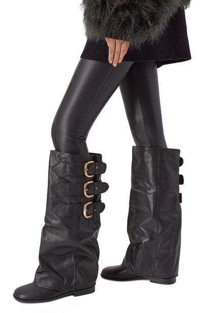 Сапоги Nature выполнили из наппы. Широкое голенище, сложенное гармошкой, украсили брендированной нашивкой, а выступающий блочный каблук – фирменной металлической эмблемой.