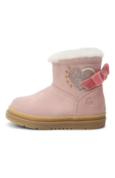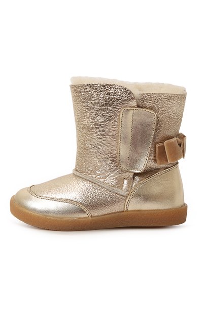 Полусапоги Cozy Hug с шерстяной отделкой внутри и фирменной заклепкой сбоку сшили из мягкой замши. Модель с резиновой подошвой, заходящей на мыс и задник, застегивается молнией и ремешком с кнопкой.