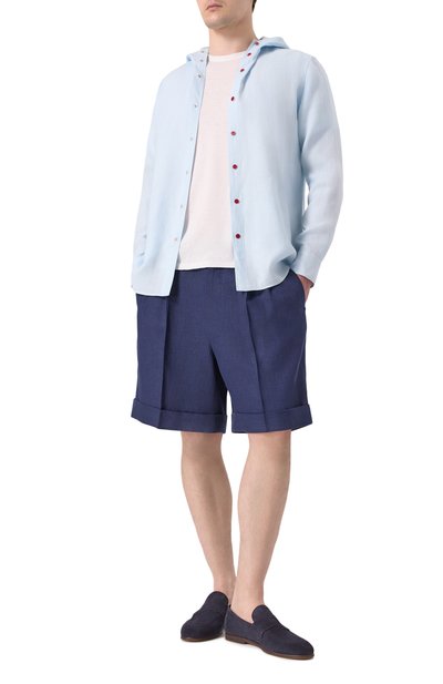 Шорты с защипами спереди и эластичной вставкой на поясе сзади выполнили из льняной ткани. Модель с двумя боковыми и парой задних карманов дополнили еще одним монетным.
