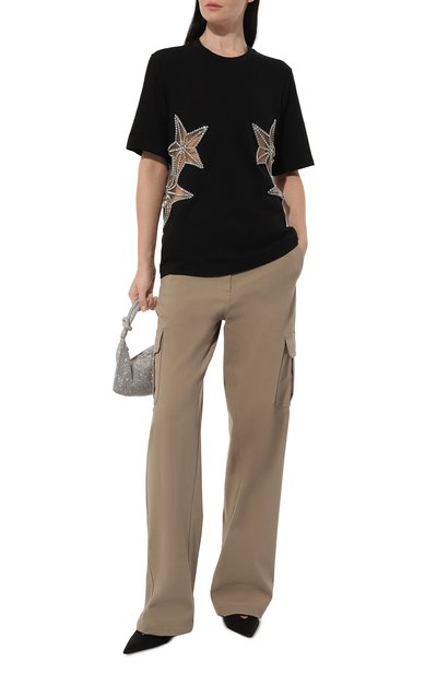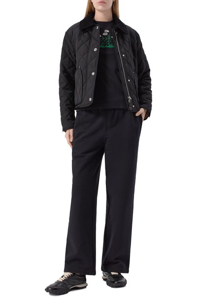 Футболку с брызгами краски и потертостями украсили монохромным принтом, напоминающим плакат музыкальной группы. Модель с круглой горловиной в рубчик изготовили из хлопкового джерси.