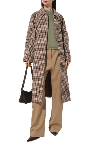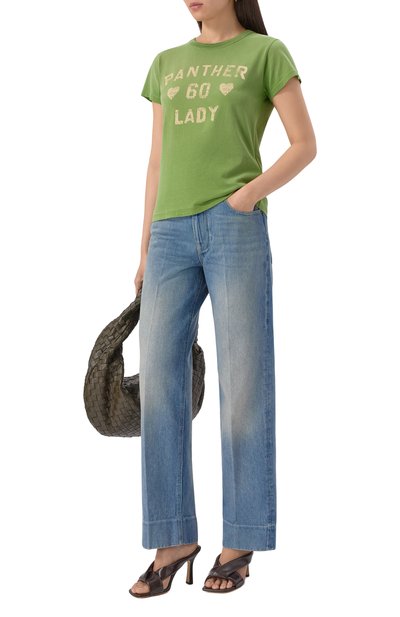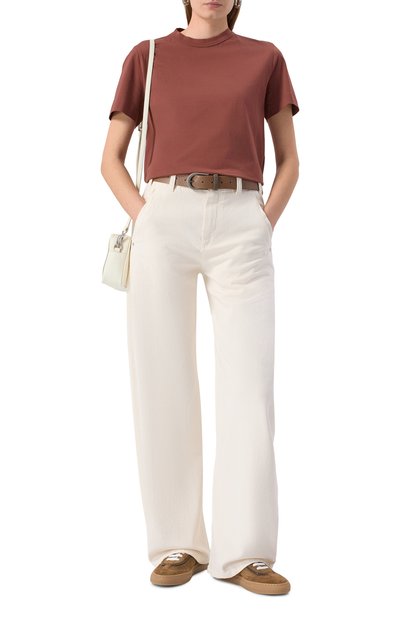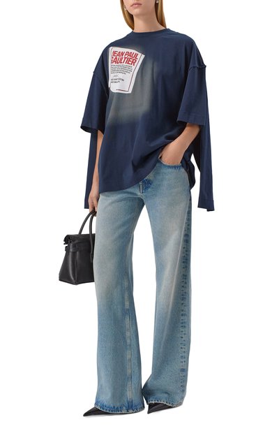 Футболку со швами спереди, сзади и на рукавах выполнили из хлопкового джерси. Свободную модель с широкой круглой горловиной в рубчик украсили нашивками с надписями.