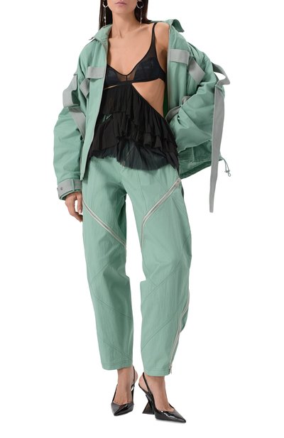 Топ с вырезом «лодочка» и широкими цельнокроеными рукавами выполнили из шелка с абстрактным мотивом. Края свободной модели подчеркнули контрастным кантом с графичным паттерном из фирменных эмблем.