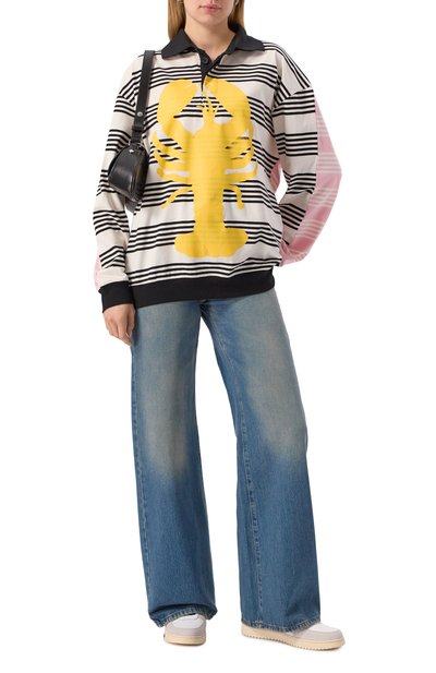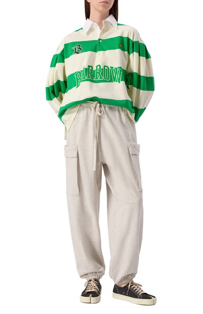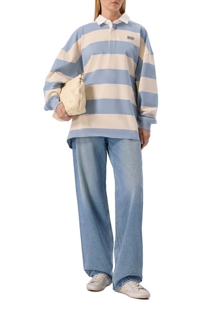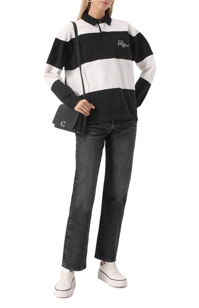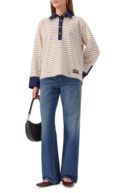 Укороченное поло свободного кроя сшили из хлопкового трикотажа в полоску. Модель с необработанными краями, однотонным воротником и спущенной линией плеч застегивается пуговицами.