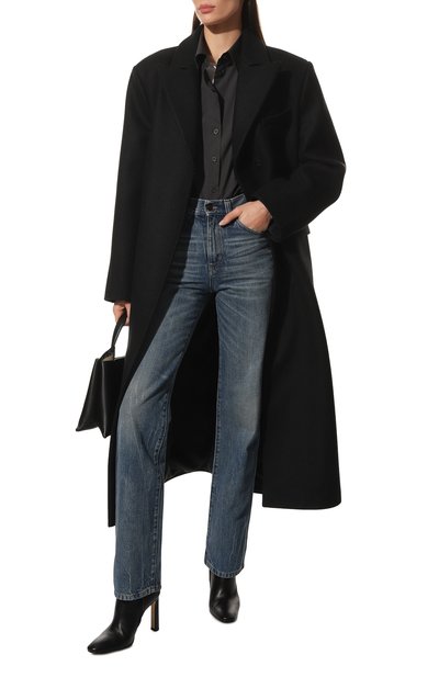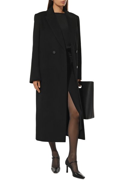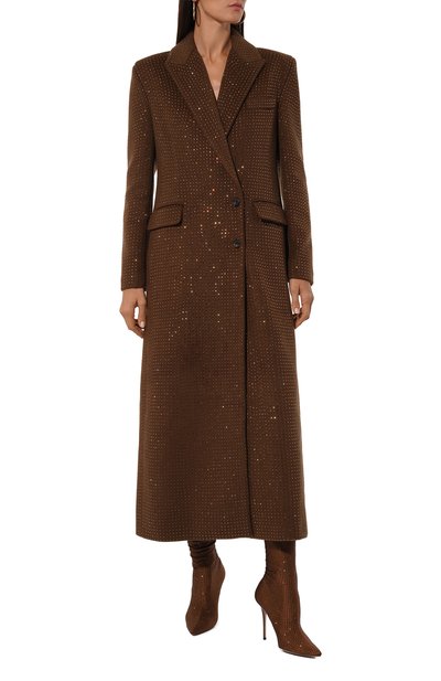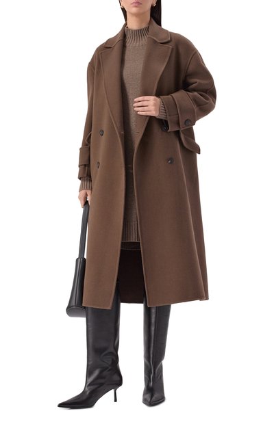 Двубортное пальто с широкими лацканами и высокой шлицей сшили из мягкой замши. Модель прямого кроя дополнили парой накладных карманов и подкладом из микса акрила и вискозы.