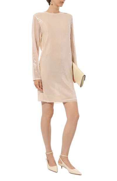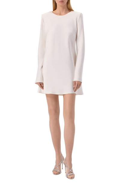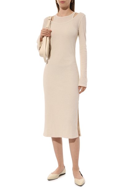 Платье с неглубокой круглой горловиной и разрезами на рукавах выполнили из рифленого трикотажа на основе лиоцелла TENCEL™ и шерсти. Сзади облегающую модель украсили брендированным ярлыком.