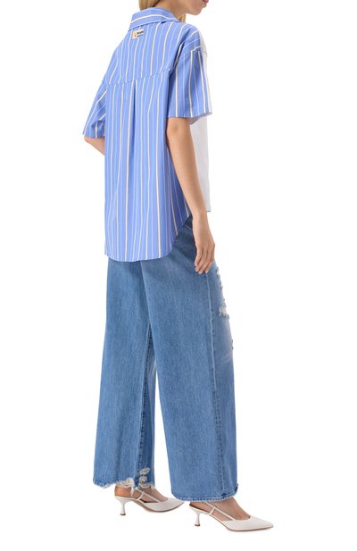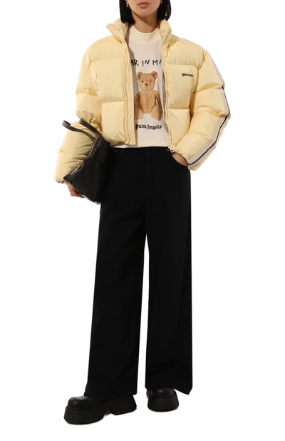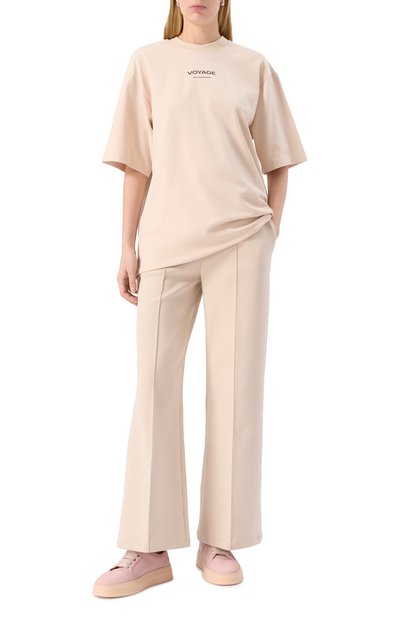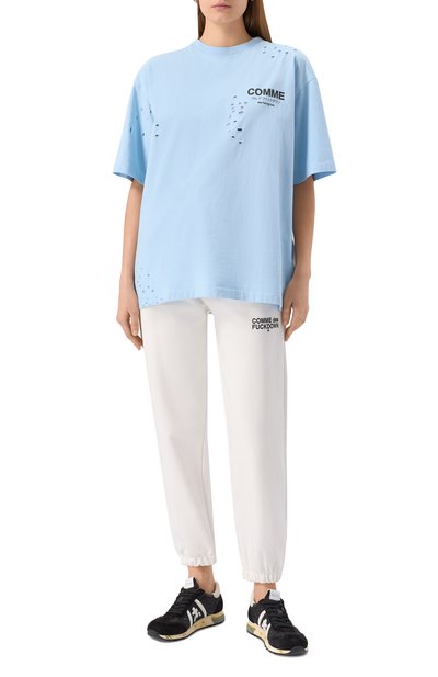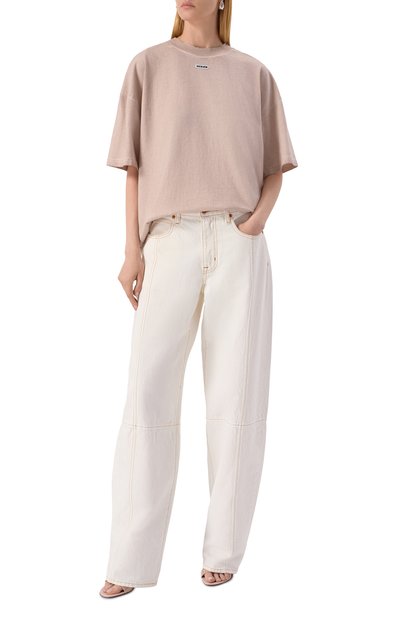 Футболка свободного кроя органично впишется в повседневные образы разной степени сложности. Модель с круглой горловиной, выполненную из чистого хлопка, декорировали брендированной лентой на спинке.