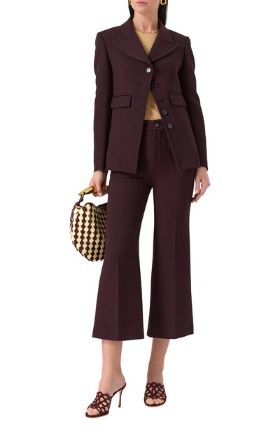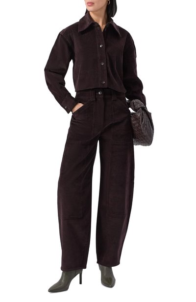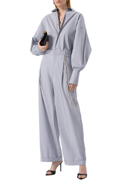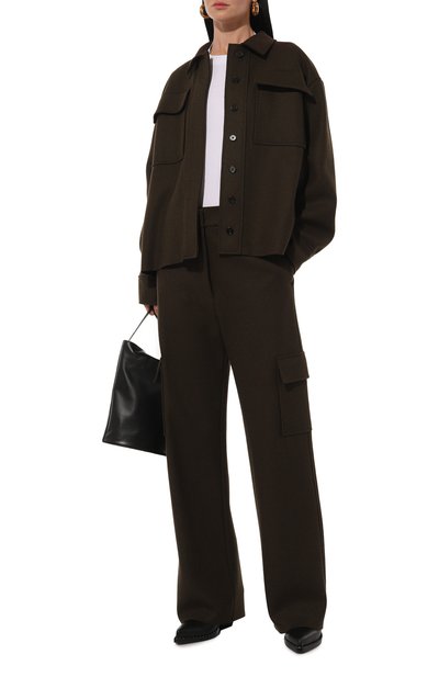 Брюки с ремешками на манжетах выполнили из хлопка с добавлением эластана. Модель с четырьмя врезными карманами дополнили парой карго с клапанами.