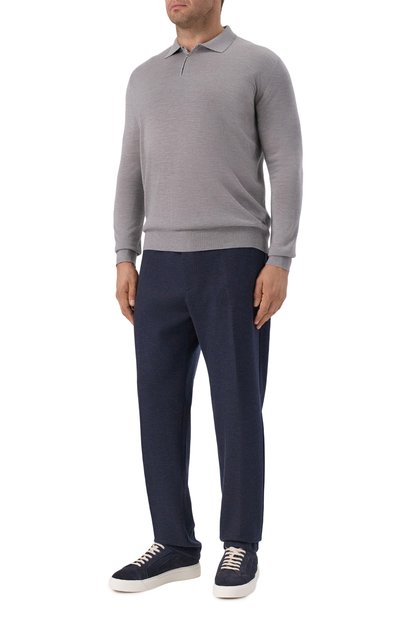 Немного зауженные брюки в едва заметную клетку выполнили из кашемировой ткани стрейч. Модель дополнили боковыми карманами и задними с пуговицами.
