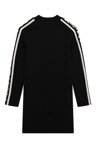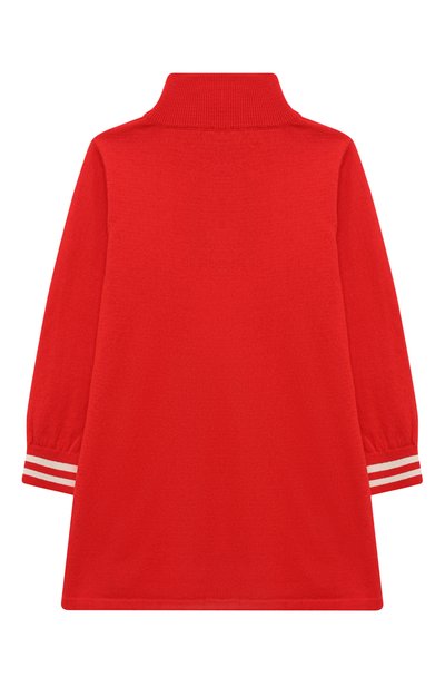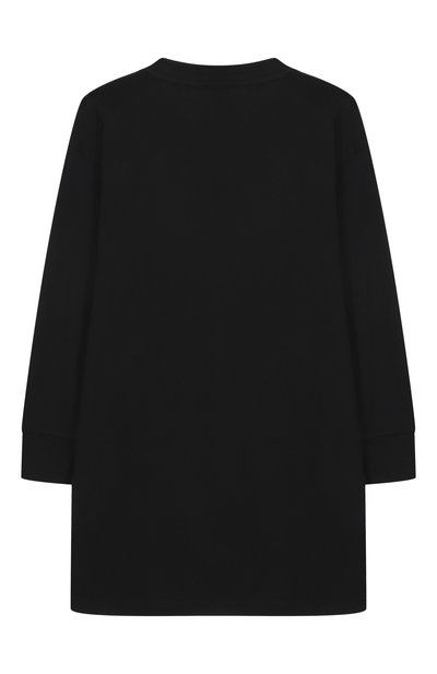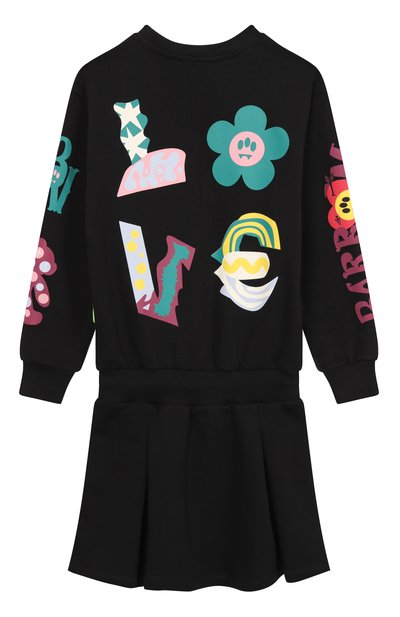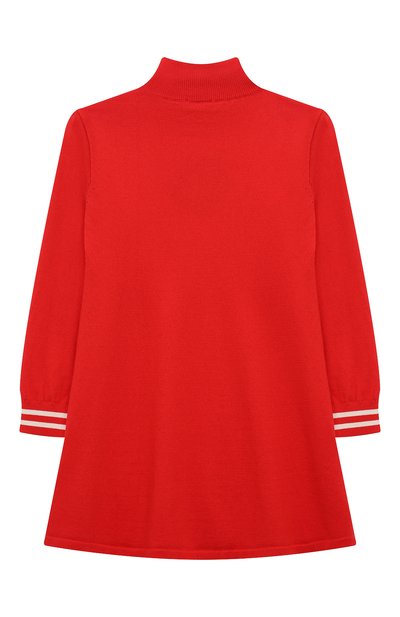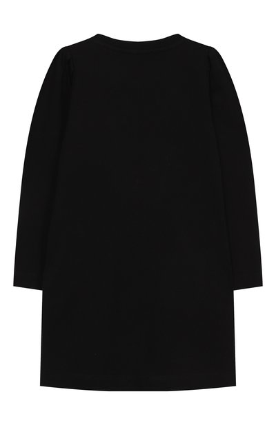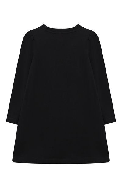 Платье с круглой горловиной выполнили из хлопкового трикотажа. Спереди модель украсили брендированным изображением фирменного медвежонка.