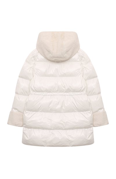 Стеганую куртку выполнили из блестящего материала оттенка Pearl Rose Off White, утеплив полиэстером. Модель с капюшоном и парой карманов по бокам украсили фирменной прорезиненной нашивкой на груди.