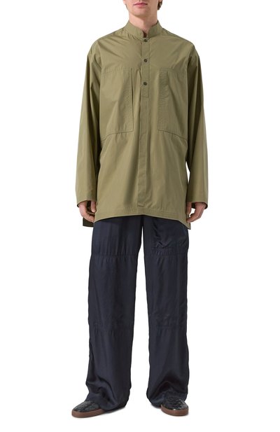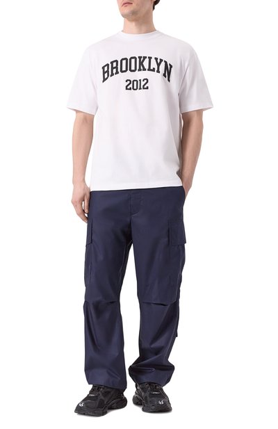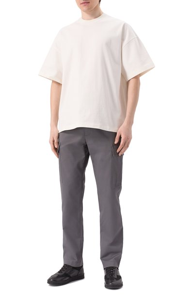 Брюки с широким поясом, стрелками и контрастными лампасами сшили из полиэстера. Модель с врезными боковыми карманами и двумя карго украсили небольшим логотипом марки.