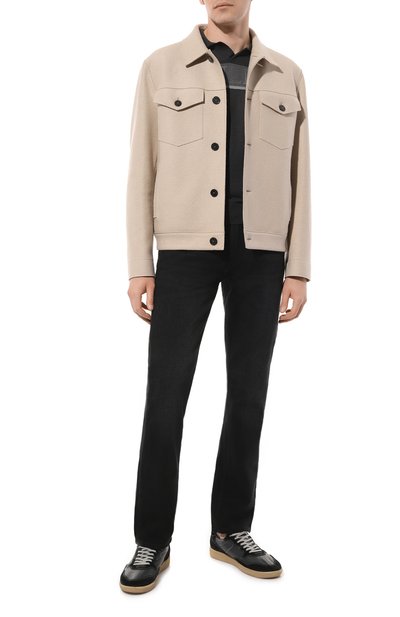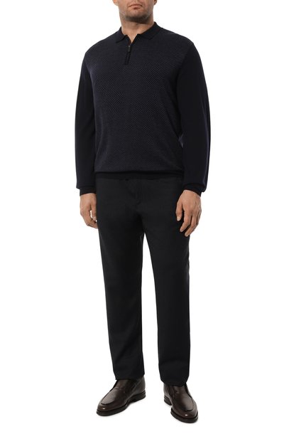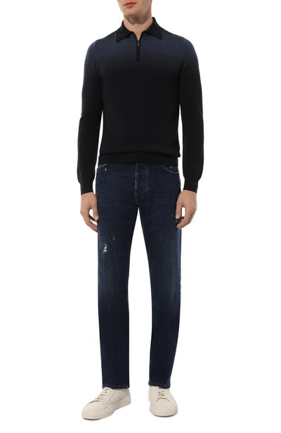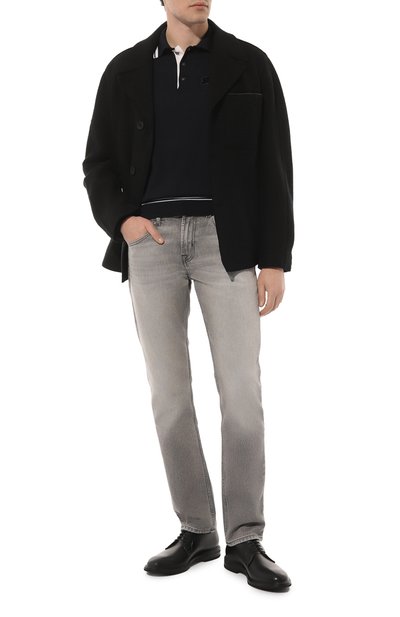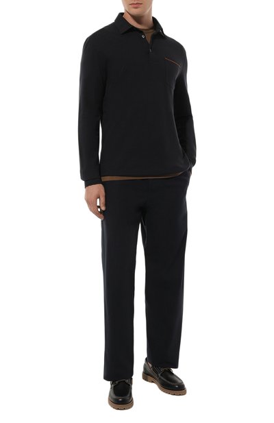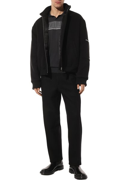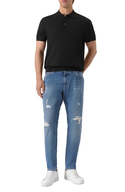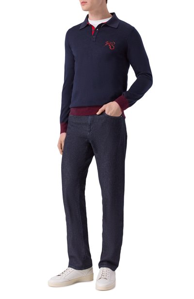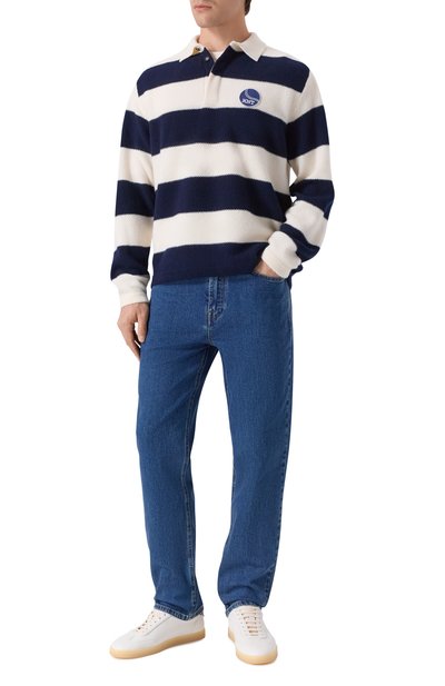 Поло со спущенной линией плеч выполнили в технике петчворк из однотонного и полосатого хлопкового трикотажа. Модель с супатной застежкой и короткими разрезами по бокам украсили логотипом спереди и фирменным мотивом на рукавах.