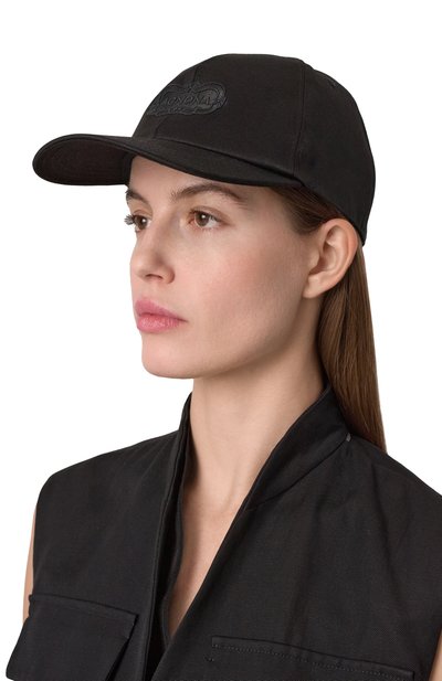 Бейсболку с потертостями украсили вышитой символикой марки. Для изготовления аксессуара с регулируемым ремешком сзади использовали хлопковый габардин.