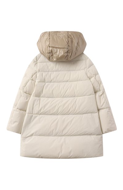Стеганый пуховик с внутренним и двумя внешними карманами сшили из переработанного матового нейлона. Капюшон дополнили съемной деталью из меха ен ота. Куртка на утином пуху застегивается молнией, скрытой под штормовой планкой с кнопками.