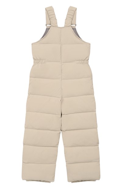 Стеганый комбинезон, утепленный утиным пухом и пером, выполнили из переработанного нейлона. Модель с эластичными лямками и молнией спереди декорировали логотипом.