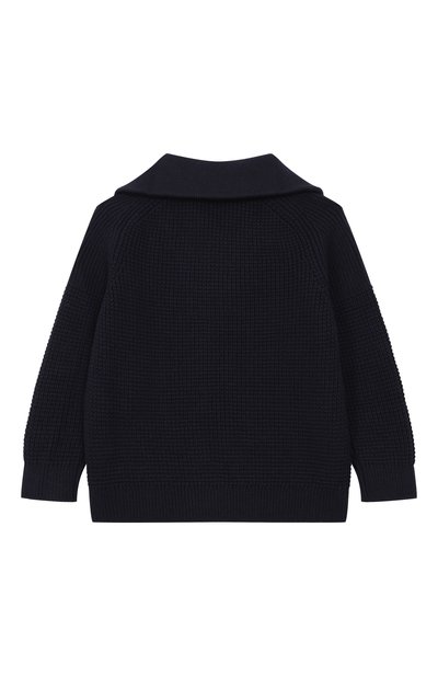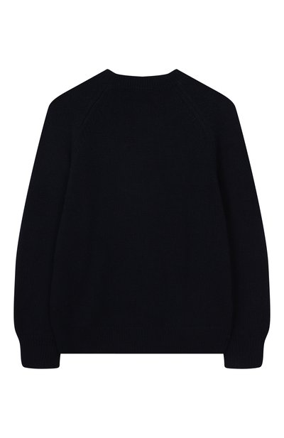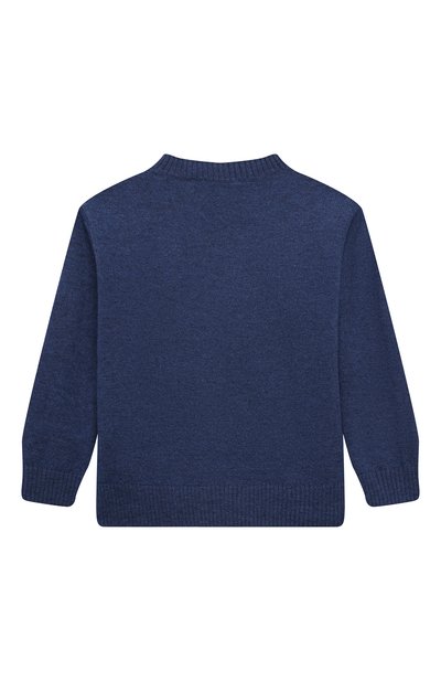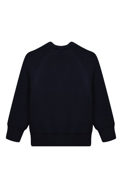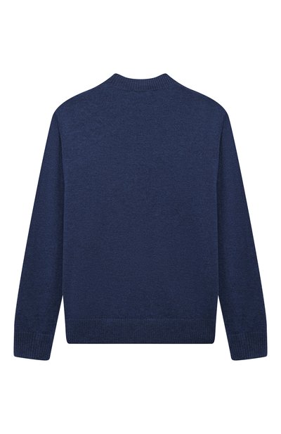 Свитер с круглой горловиной в рубчик и слегка спущенной линией плеч связали из шерсти мериноса. Выполненное в технике интарсии ироничное изображение таксы на модели спереди дополнили вышитым логотипом.