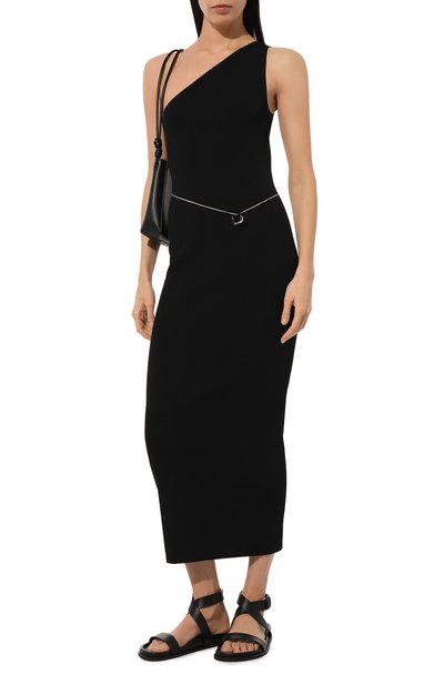 Облегающее мини-платье Sbonny в рубчик выполнили из трикотажа на основе вискозы. Модель с высокой горловиной декорировали логотипом на спинке и полосками из граненых стразов.