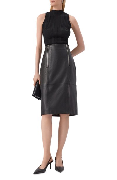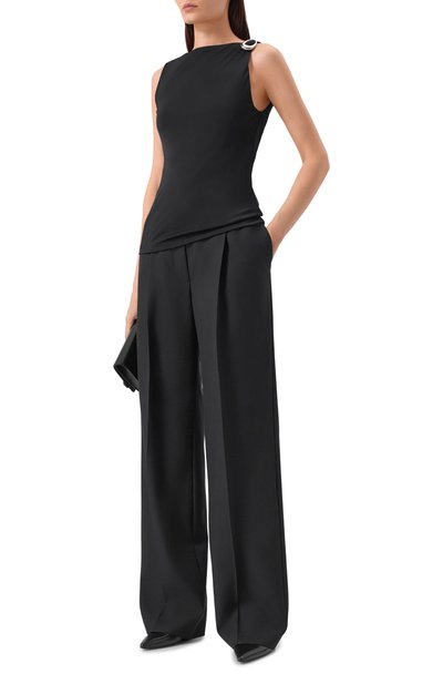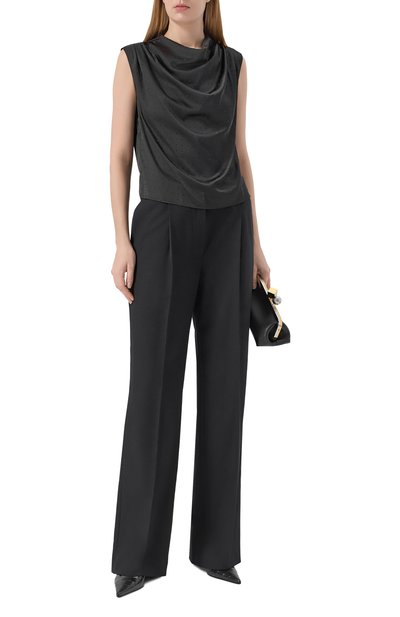Приталенный топ с высоким воротом выполнили из слегка мерцающего микса полиэстера и эластана с брендированным узором. Модель застегивается потайной молнией с пуллером в виде логотипа.
