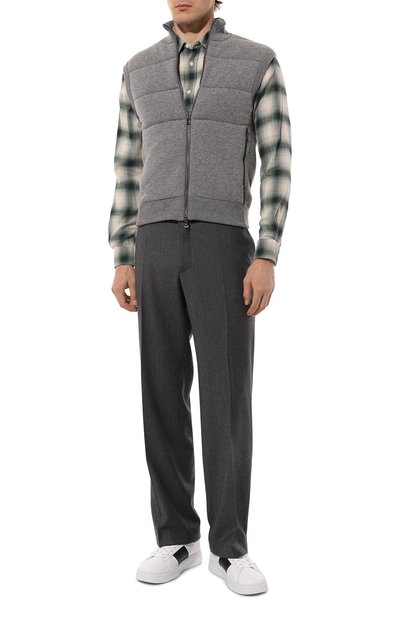 Клетчатую рубашку с закругленной линией низа сшили из хлопковой фланели. Модель свободного кроя дополнили нагрудными карманами с клапанами.