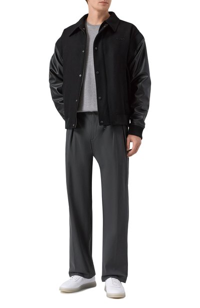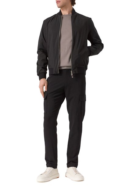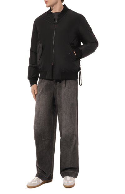 Бомбер с трикотажными манжетами, поясом и воротником-стойкой выполнили из гладкого нейлона. Oversize-куртка с тремя фирменными отверстиями на спинке застегивается встречной молнией, а клапаны двух карманов – кнопками.