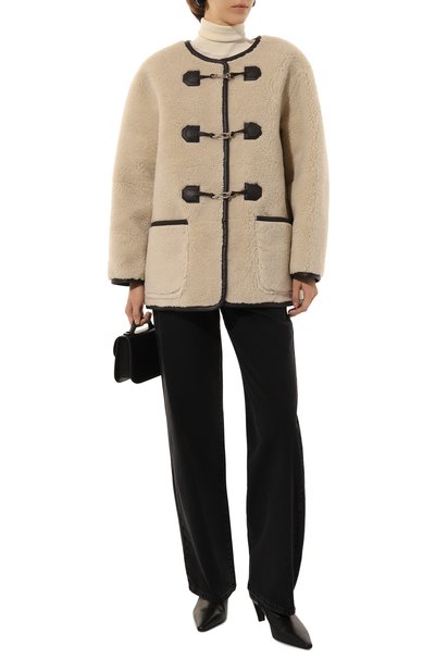 Дубленку со спущенной линией плеч и двумя карманами по бокам выполнили из искусственной овчины. Модель с контрастным меховым кантом и воротником застегивается роговыми пуговицами.