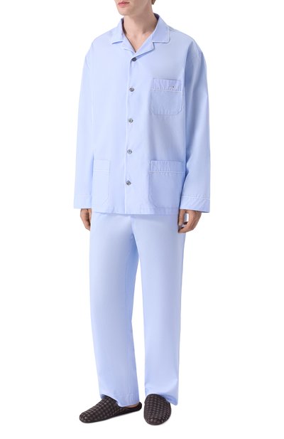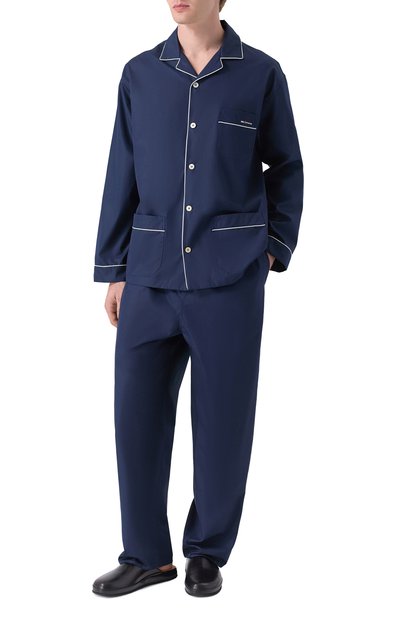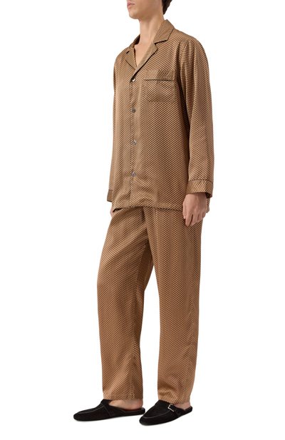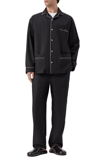 Сорочка из чистого шелка с брендированным мотивом составит комфортный пижамный комплект с парными брюками. Пуговичную план ку модели подчеркнули контрастными кантами, повторив отделку на нагрудном и боковых карманах.