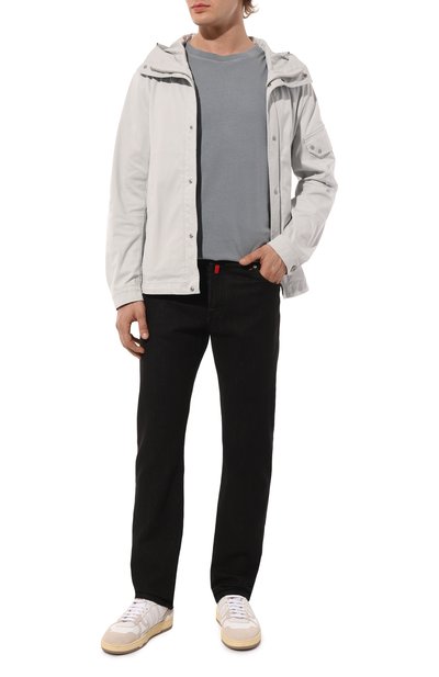 Джинсы с пятью карманами выполнили из микса хлопка, полиэстера и эластана. Брюки украсили вышивкой, биркой и брендированным жакроном фирменного алого оттенка.