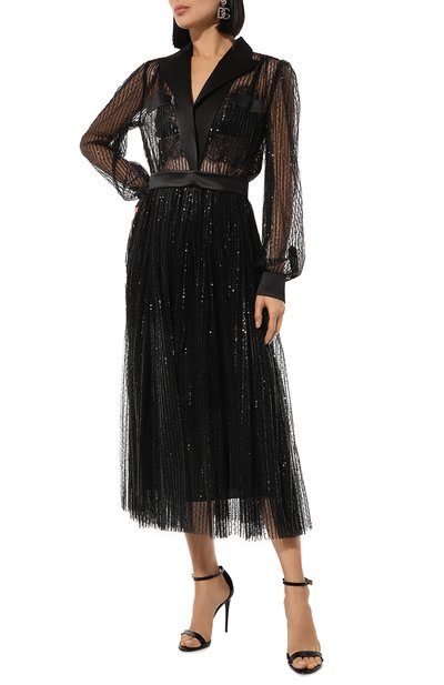 Платье с V-образным декольте изготовили из полупрозрачного тюля на основе шелка и полиэстера, расшитого широкими полосами из глянцевых пайеток. Модель с разрезами на подоле и рукавах застегивается потайной молнией сзади.