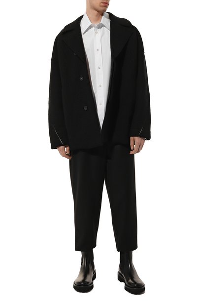 Для пошива рубашки с воротником button down и бантовой складкой на спинке использовали эластичный хлопковый поплин. Модель свободного кроя украсили вышитыми геральдическим символом марки.