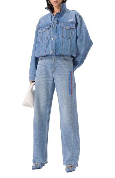 Зауженные джинсы с пятью карманами выполнили из хлопкового денима с добавлением полиэстера. Пояс модели сзади дополнили брендированным патчем.