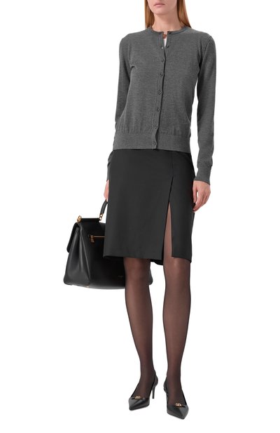 Свободный кардиган с V-образным вырезом и накладными карманами связали из чистого кашемира. Рифленая модель с отделкой в рубчик застегивается фирменными пуговицами Lion Head.
