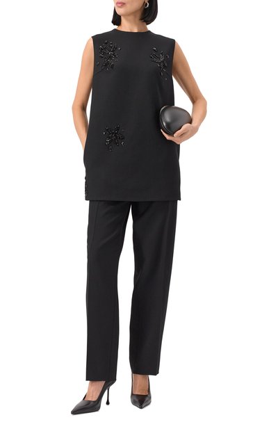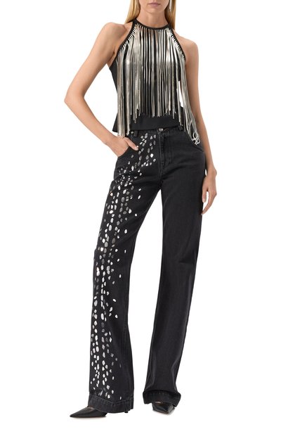 Облегающий топ с воротником-стойкой сшили из фактурного полиамидного трикотажа с добавлением вискозы. Модель застегивается широкой молнией с крупным брендированным пуллером.