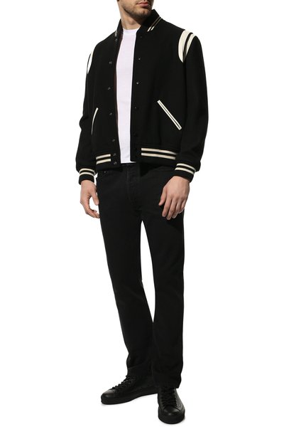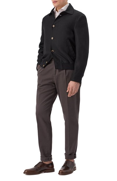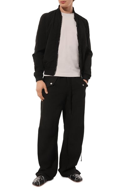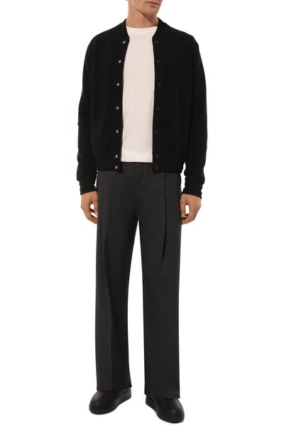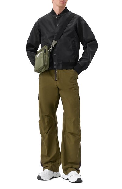 Бомбер с атласными рукавами и двумя врезными карманами выполнили из шерсти. Спереди нитью в тон вышили логотип марки. Куртка с воротником, манжетами и поясом из трикотажа застегивается золотистыми брендированными кнопками.