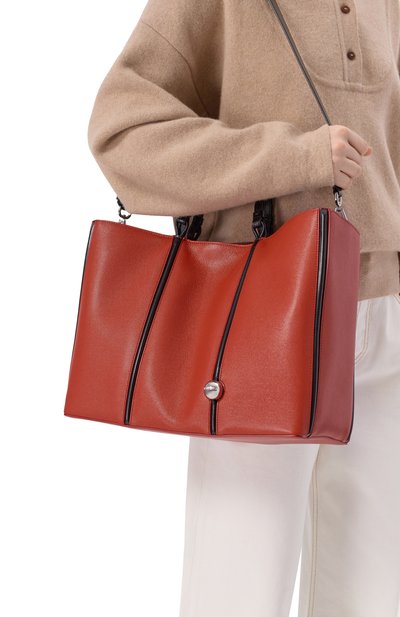 Сумку-тоут 1945 Soft с карманом и карточным слотом внутри сшили из кожи. У аксессуара с металлическими пуклями предусмотрели две пары ручек с цепочками. Модель с боковыми панелями на кнопках украсили логотипом марки.