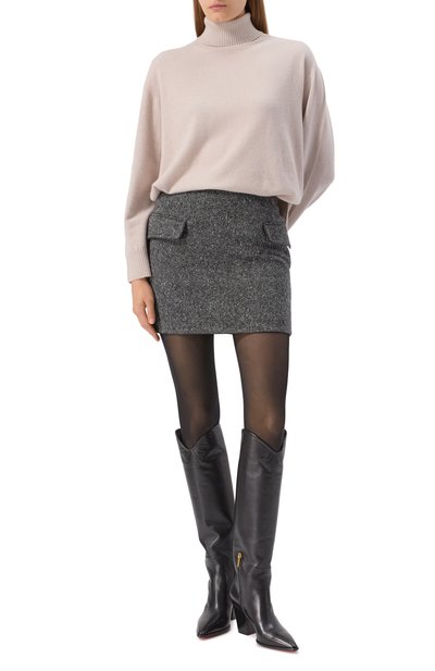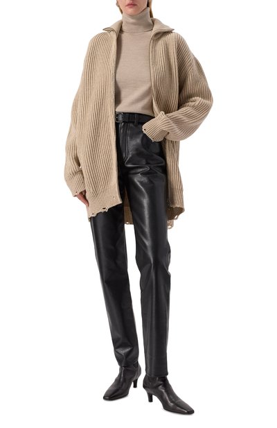 Водолазку с длинными рукавами и спущенной линией плеч сшили из шерстяного трикотажа с добавлением кашемира. Лаконичную модель дополнили широкими манжетами, поясом и высоким воротом в рубчик.