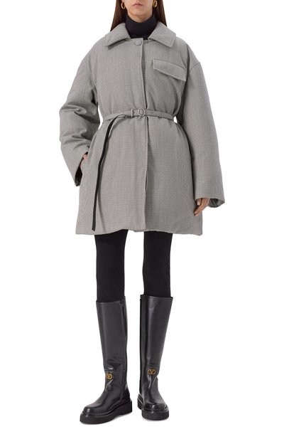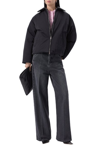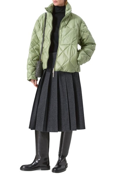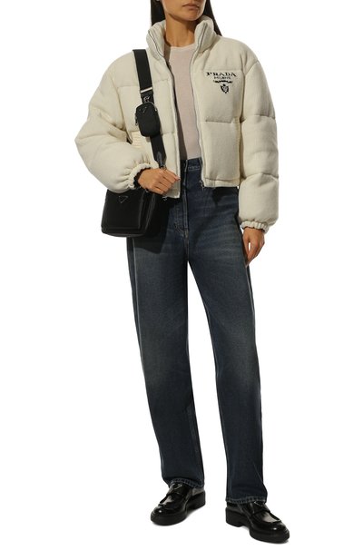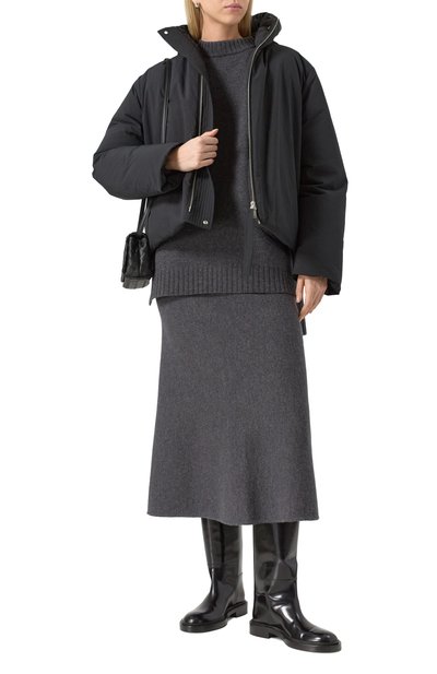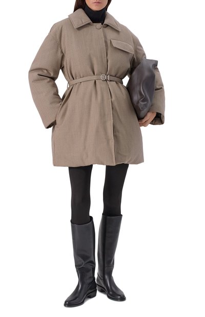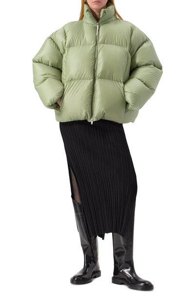 Oversize-пуховик из водоотталкивающего вторичного полиэстера дополнили капюшоном, а также внутренними и внешними карманами. Сбоку куртку на гусином пуху украсили кожаной брендированной нашивкой.