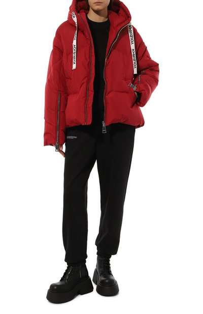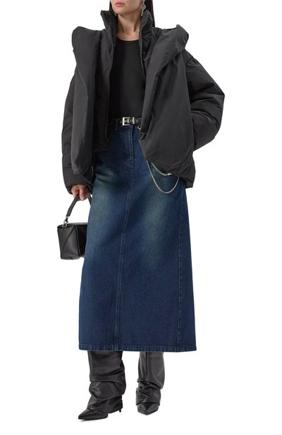 Oversize-пуховик из водоотталкивающего вторичного полиэстера дополнили капюшоном, а также внутренними и внешними карманами. Сбоку куртку на гусином пуху украсили кожаной брендированной нашивкой.