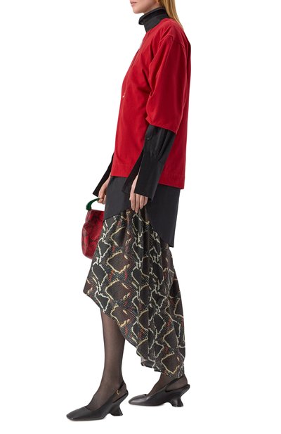 Кожаные туфли, застегивающиеся узким ремешком с пряжкой сбоку, установили на тонкую подошву с низким каблуком. Рельефный шов на зауженном мысе подчеркнули заклепками.