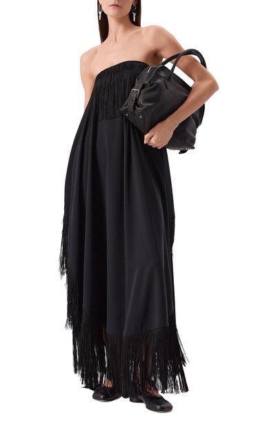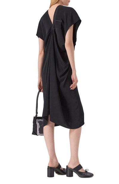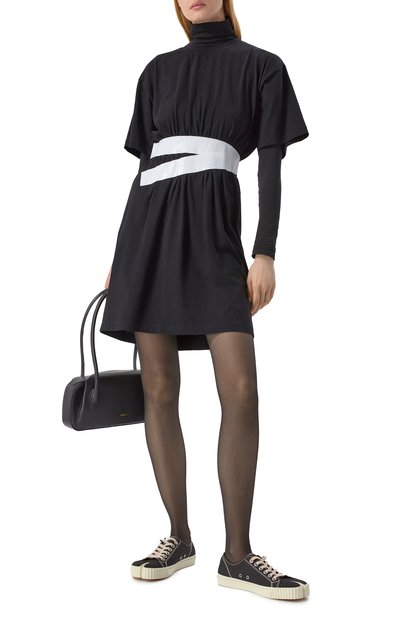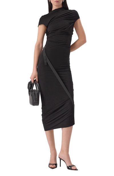 Облегающее мини-платье Drapeado выполнили из стрейчевого гладкого джерси на основе вискозы. Модель с открытым плечом, коротким рукавом и асимметричным вырезом декорировали драпировками.