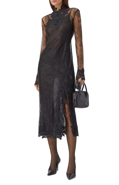 Драпированное платье на подкладе выполнили из эластичного нейлонового тюля с цветочным принтом. Облегающая модель с фигурным декольте застегивается потайной молнией сзади.