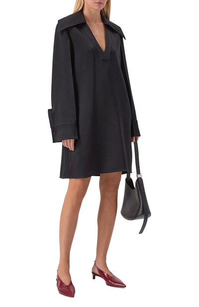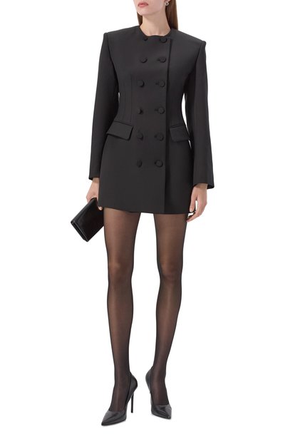 Приталенное мини-платье с акцентированной линией бедер, парой карманов и потайной молнией на спинке выполнили из стрейчевой ткани на основе полиэстера. Модель с глубоким фигурным вырезом декорировали спереди крупными серебристыми пуговицами в виде цветов с кристаллами.