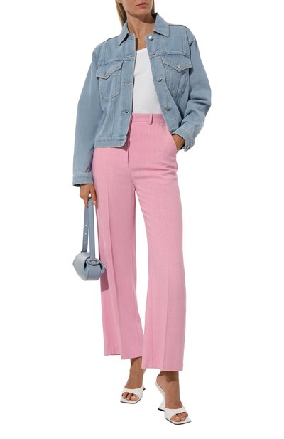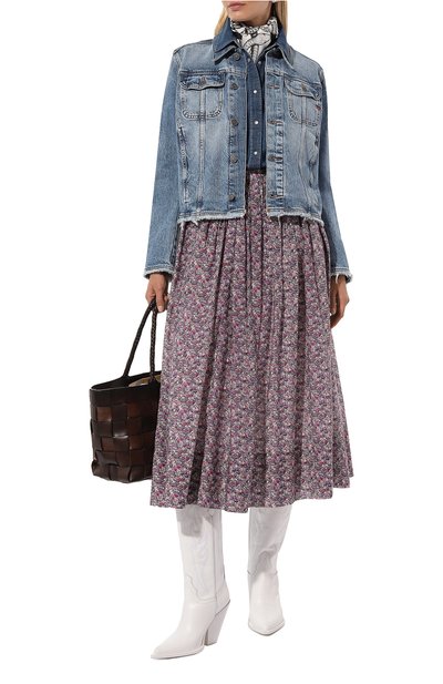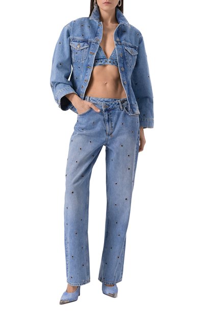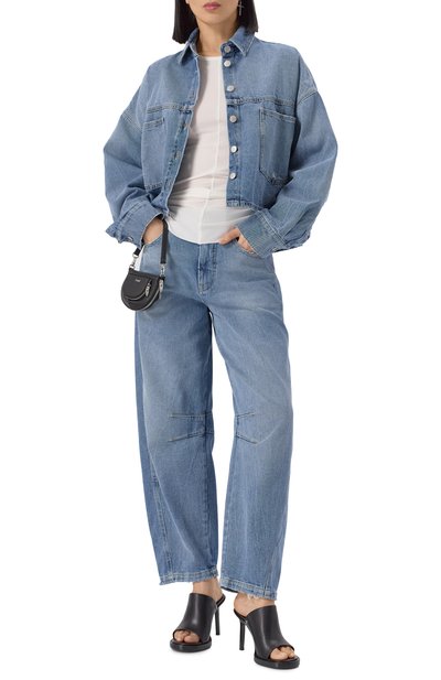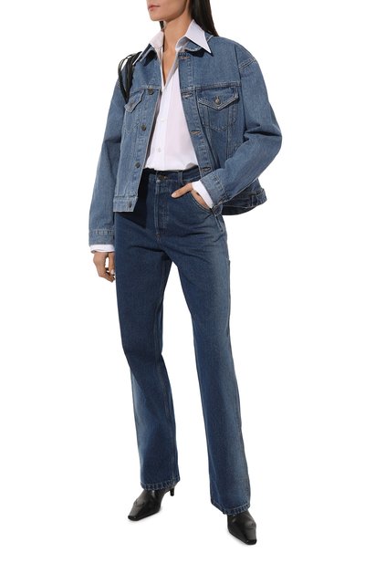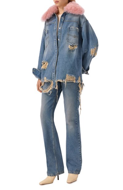 Джинсовую куртку De-Katerin-Fsh с двумя нагрудными карманами сшили из хлопкового денима с добавлением пеньки. Приталенную модель в готовом виде обработали лазером, камнями и ферментами для получения декоративных потертостей.